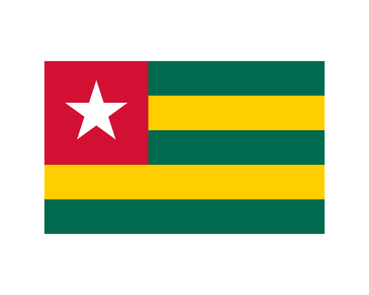 多哥共和國,簡稱多哥,是西非國家之一,東面與貝寧,北面與布基納法索,西面與加納相鄰,南面有一小段海岸線面向幾內(nèi)亞灣,首都洛美。多哥國旗呈長方形,長寬之比約為1.618:1。由三道綠色橫條和兩道黃色橫條相間排列組成,旗面左上角為一紅色正方形,其正中有一顆白色五角星。綠色代表農(nóng)業(yè),又象征希望;黃色象征國家的礦藏,還表示人民的信心和對祖國命運的關(guān)心;紅色象征人類的真誠、博愛與獻身精神;白色象征純潔;五角星象征國家的獨立和人民新生。