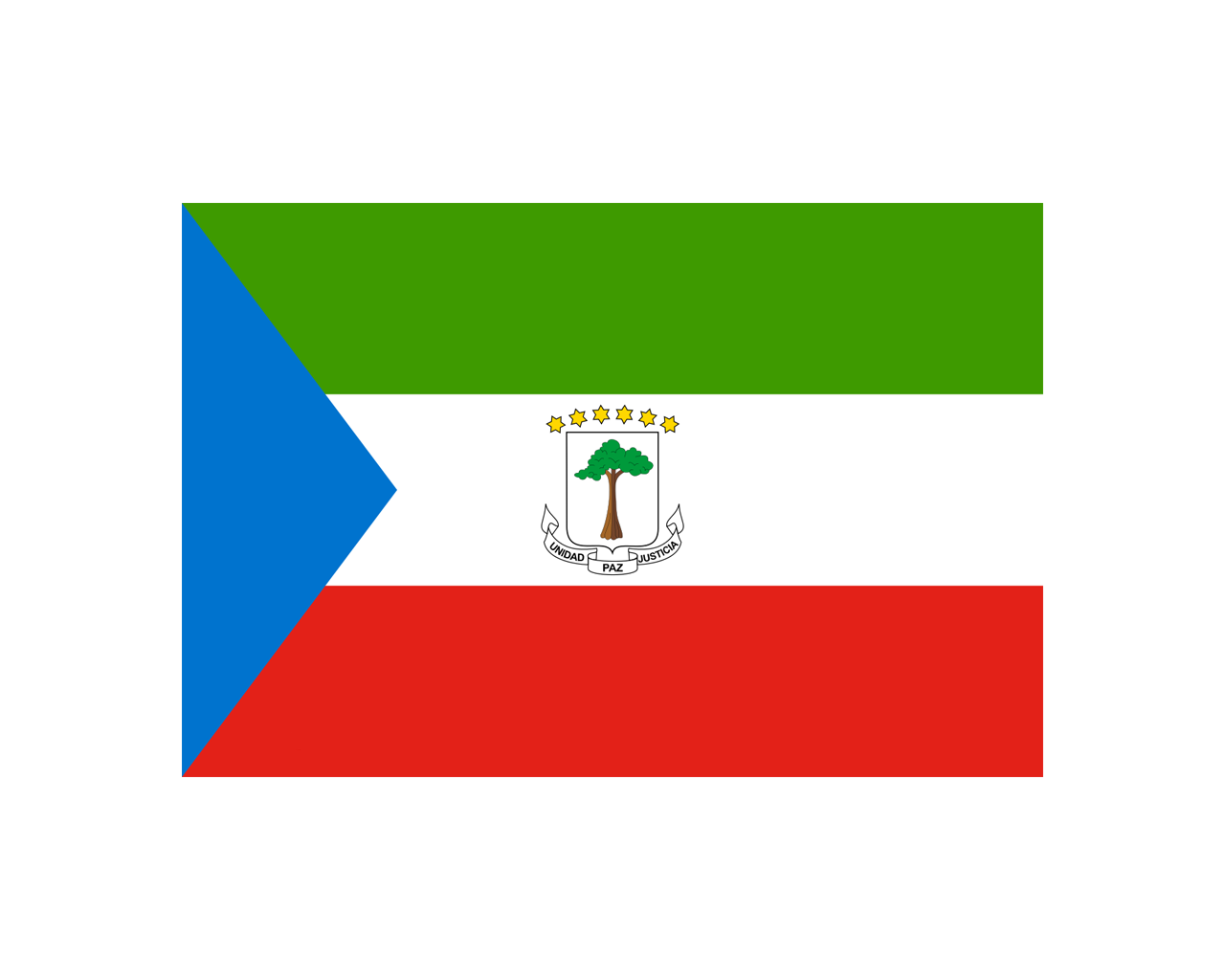 赤道幾內(nèi)亞共和國(guó)(The Republic of Equatorial Guinea),位于非洲中西部,西臨大西洋,北鄰喀麥隆,東、南與加蓬接壤,首都馬拉博。赤道幾內(nèi)亞國(guó)旗為長(zhǎng)方形,長(zhǎng)寬之比為3:2。靠旗桿一側(cè)為藍(lán)色等腰三角形,右側(cè)為三個(gè)平行寬條,自上而下分別為綠、白、紅三色,旗面中央有國(guó)徽?qǐng)D案。綠色象征財(cái)富,白色象征和平,紅色象征為獨(dú)立而斗爭(zhēng)的精神,藍(lán)色象征海洋。