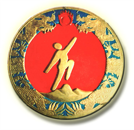 方字變化為人,飛于方山之上,寓意方姓因方山得姓,外環(huán)雙龍吞日寓意中華文明,色彩紅黃為主,顯示風貌昂揚向上