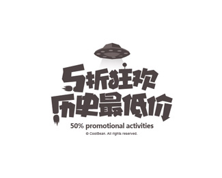 活動的標語是“5折狂歡歷史最低價”,設(shè)計師巧妙的融入的飛碟、火箭噴霧、箭頭元素,與活動主題詞想關(guān)聯(lián)。