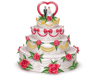 豪華婚禮蛋糕寫實(shí)圖標(biāo)設(shè)計(jì),融入婚禮、玫瑰、葉子、彩簾等元素。