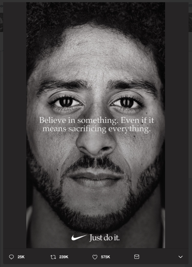 耐克x科林·凱珀尼克。我特別喜歡美式足球和49人隊。卡佩尼克曾是他們的四分衛,后來因為在國歌響起時跪著抗議與種族有關的警察暴行而被解職。廣告爆炸,因為具體的政治,但從根本上講,挑大梁年代偉大,因為它表達了積極的運動:靈感,英雄主義和挑戰逆境只看它也有個人共鳴,因為它讓我想起了熬夜看早期的90年代;s通道4突出顯示和我爸爸關于萬福馬利亞次達陣時,單手抓住和可怕的名字像喬·蒙大拿。