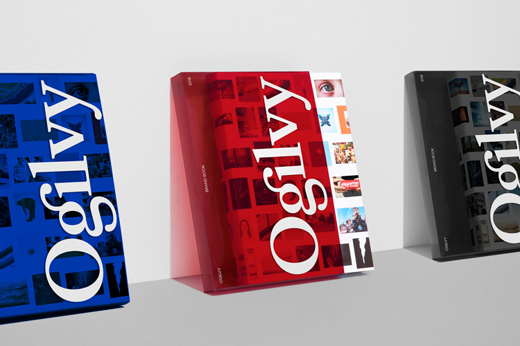這是一個新的定制的無襯線字體,叫做Ogilvy Sans,一個更新品牌色體系包括深藍色、灰綠色、粉紅色和灰色。